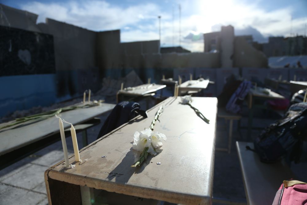 4月6日,在伊朗首都德黑兰市举行的悼念活动现场,组织者搭建起小学教室遭袭场景并在课桌上摆放鲜花,悼念遭美以空袭遇难的米纳卜小学学生。新华社记者沙达提摄