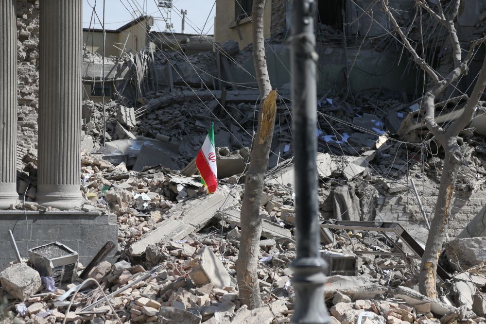 这是3月4日在伊朗德黑兰革命广场附近拍摄的一处损毁的建筑。新华社记者沙达提摄